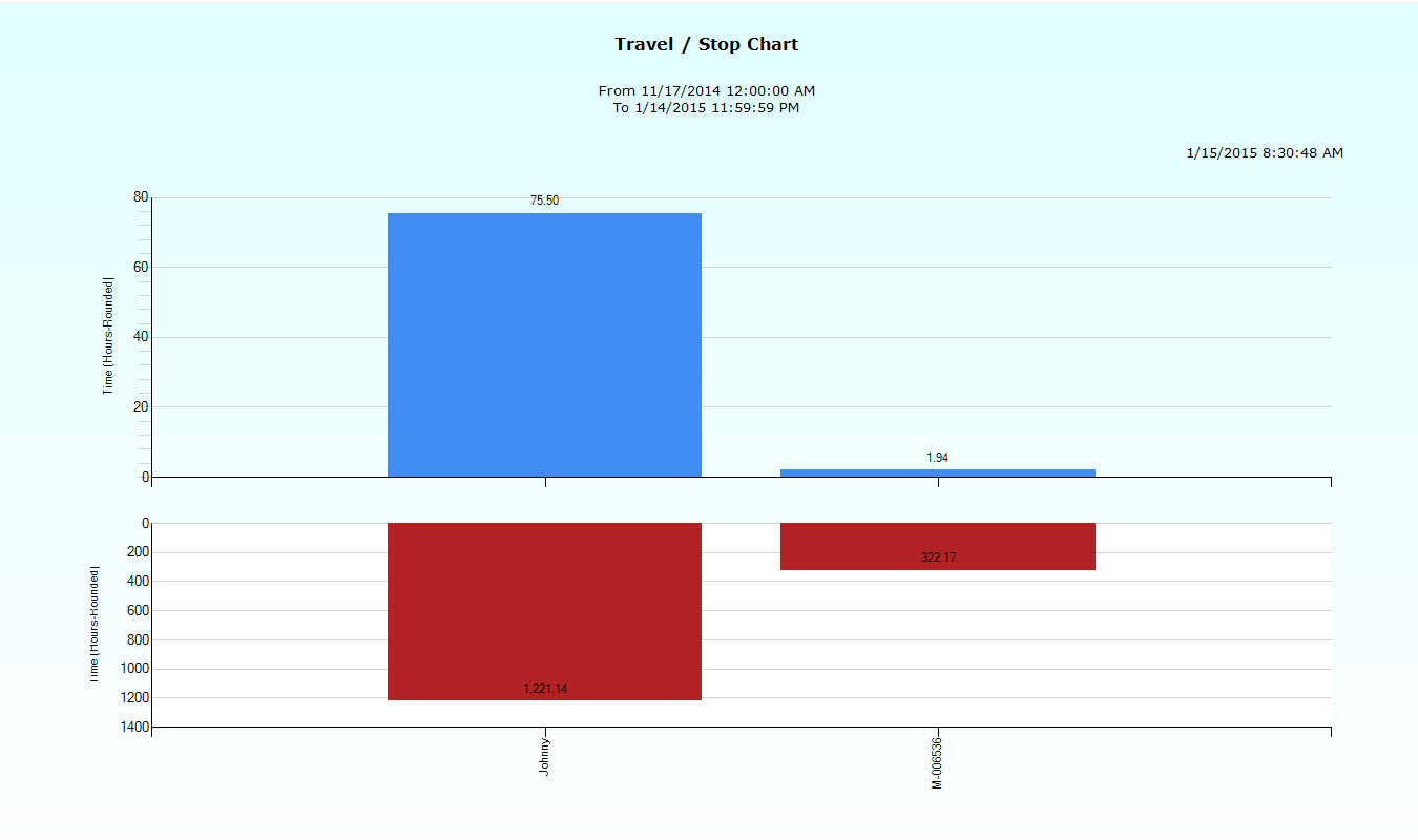 Travel/Stop Chart This visual shows side-by-side comparisons of each vehicle with regards to being in use and stopped. It is often used as a tool to correct and motivate employees to make more efficient stops during the day. Back to Reporting